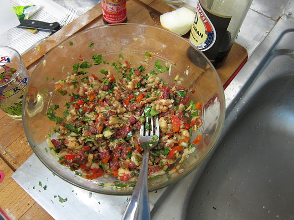 他竟然已經把剁碎的紅椒跟洋蔥拌進去料裡面了.