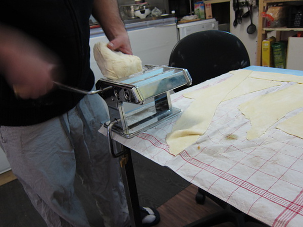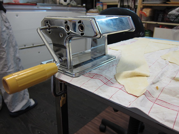 所以他一早起來就拿出他的義大利麵機來桿麵皮.