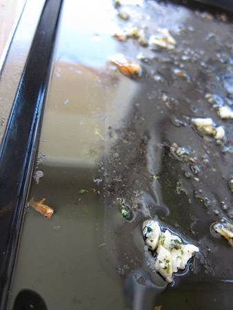 烤盤裡面留著橄欖油,大蒜與羊肉的肉汁與油.